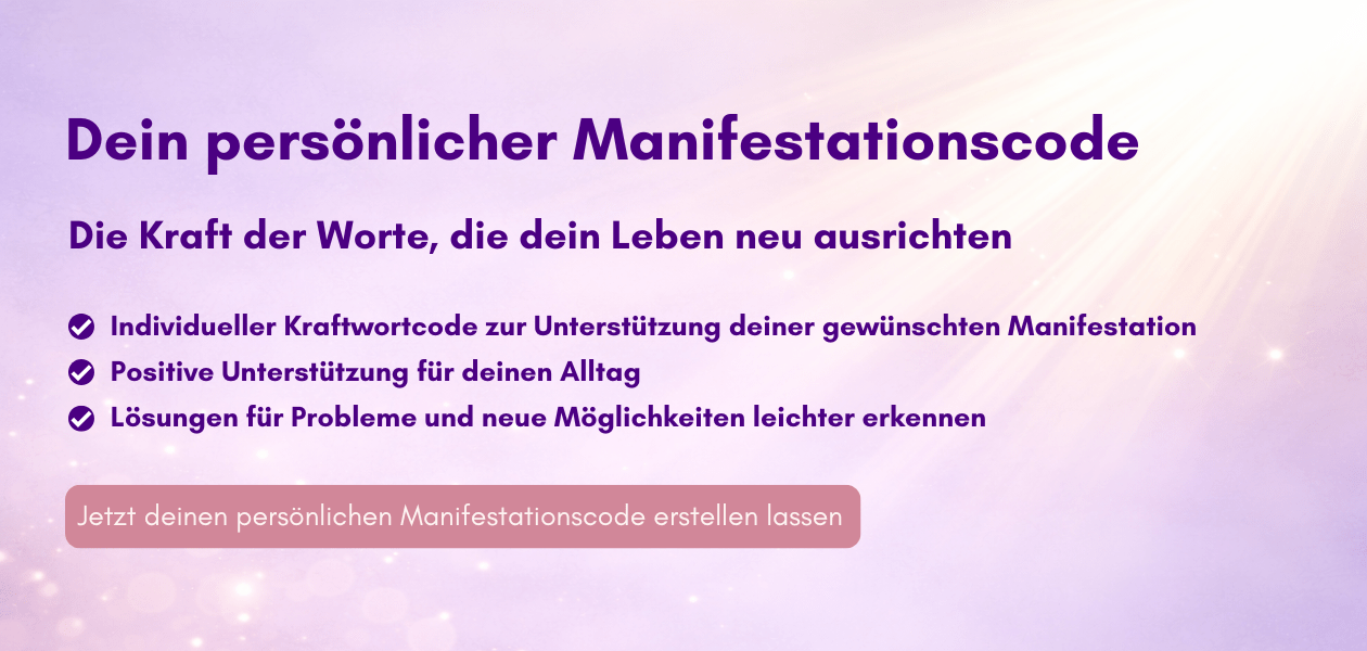 Auch für dein Anliegen oder deinen Wunsch stelle ich dir gern deinen persönlichen Manifestationscode zusammen und erkläre dir, wie du diese besonderen Worte im Alltag wirkungsvoll einsetzen kannst.